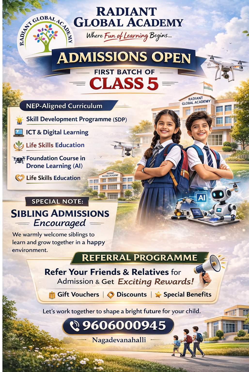 🌱 At Radiant Global Academy; we help turn those dreams into reality with care, values, and modern learning. We are happy to announce that Admissions are now open for the First Batch of Class 5. 🎓 Our NEP-aligned curriculum includes: ✨ Skill Development Programme (SDP)-💻 ICT & Digital Learning 🧠 Life Skills Education 🚁 Foundation Course in Drone Learning 🤖 Foundation Course in Artificial Intelligence (AI) We focus on building confidence, creativity, and real-life skills so every child grows strong and future-ready. ⭐ Special Note: We warmly encourage sibling admissions so children can learn and grow together in a happy environment. 🎁 Referral Programme Refer your friends or relatives and be a part of our growing family. For every successful admission, you will receive a special benefit/reward as our token of appreciation. Let us join hands to give every child a bright and successful future. 📞 For admissions: 9606000945 Regards, Management