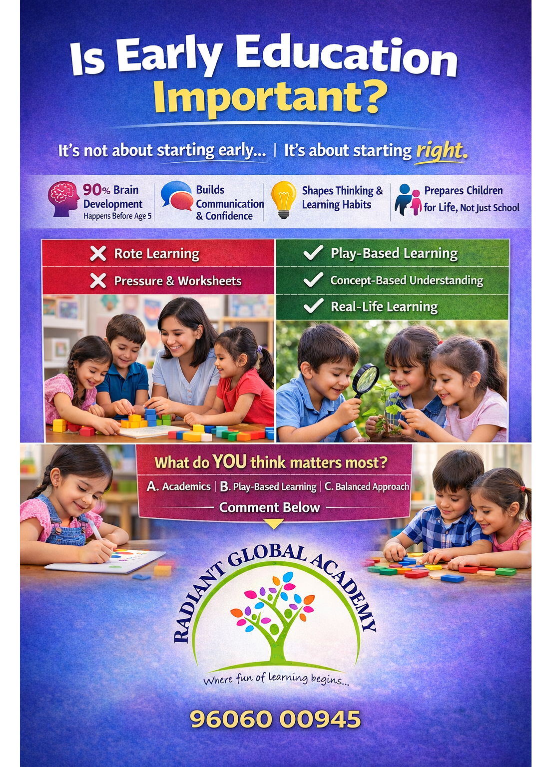 At Radiant Global Academy, we believe early education is not about pressureโฆ ๐ Itโs about building the right foundation. ๐ง 90% of brain development happens before age 5 ๐ฃ๏ธ Strong communication & confidence begin early ๐ค Social & emotional skills are developed ๐ Learning habits are shaped for life Thatโs why we focus on: โ Play-Based Learning โ Concept-Based Understanding โ Activity & Real-Life Learning No rote learning. No unnecessary pressure. Only meaningful learning that helps children grow with confidence ๐ ๐ Visit Us Radiant Global Academy Nagadevanahalli | Kengeri | Nagarbhavi Best Preschool in Kengeri | Schools in Nagarbhavi | Preschool near Nagadevanahalli | Early Education Bangalore | Play School Near Me